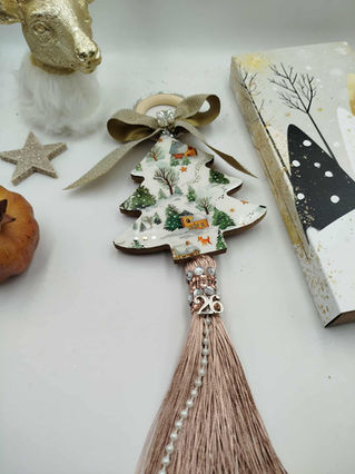 Κρεμαστό γούρι σε ξύλο και ρητίνη με μεγάλη φούντα και μεταλλικό '26 στο κουτί του