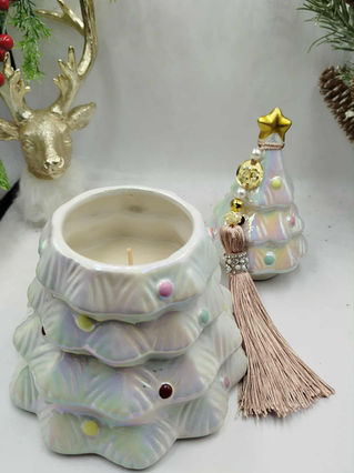 Μεγάλο κεραμικό δέντρο κερί με καπάκι σε διάφορα χρώματα, με φούντα γούρι '26 σε εορταστική τσαντα